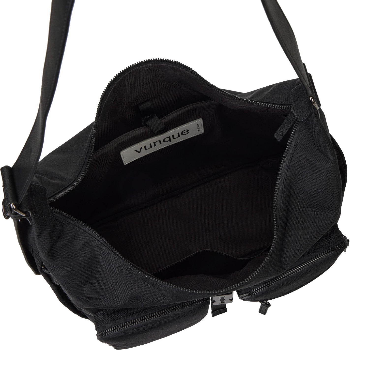 外側にはジッパーポケット2つ、オープンポケット3つ、内側にはジッパーポケット1つと仕切りオープンポケット2つを備えています。